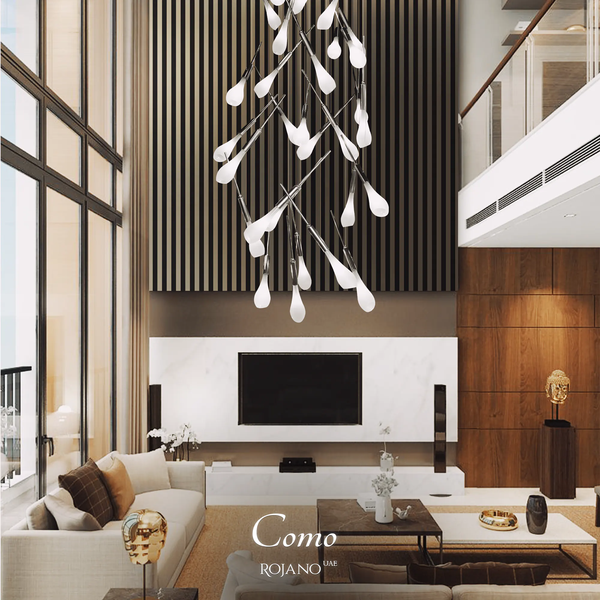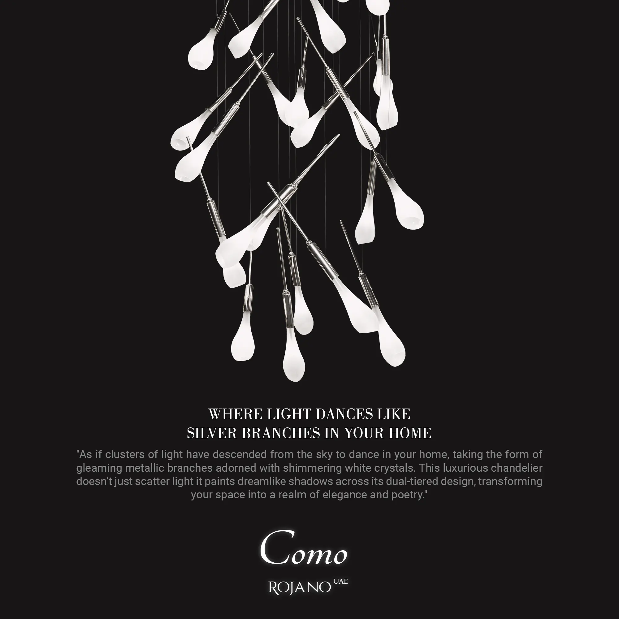 كأن عناقيد الضوء قد نزلت من السماء لترقص في غرفة منزلك، متخذةً شكل فروع معدنية لامعة مرصعة بجواهر بيضاء متلألئة. هذه الثريا الفاخرة لا تنثر الضوء فحسب، بل تصنع لوحات من الظلال الخيالية عبر مستوياتها المزدوجة، لتحول الفضاء إلى عالم من الأناقة والشعر. كل نظرة إلى هذه التحفة المعلقة تحكي قصة من الجمال والنور، لتكون أكثر من مجرد مصباح، بل مصدر إلهام يهمس بأناقة وروعته في صمت المنزل.