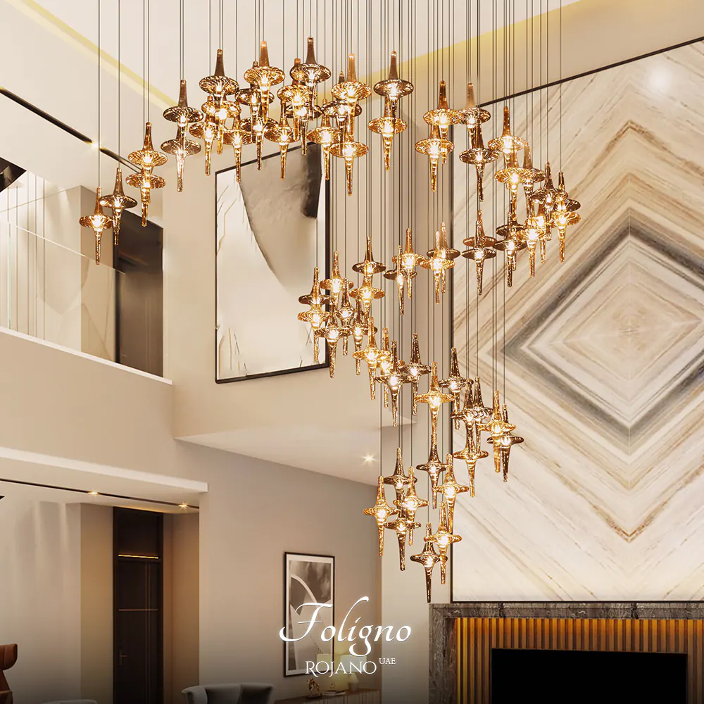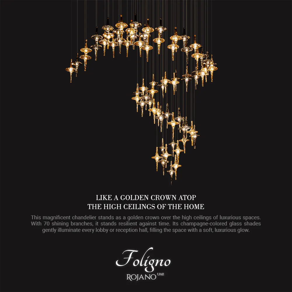 تأتي هذه الثريا الرائعة كالتاج الذهبي فوق أسطح المنازل العالية، حيث تزين السقف بأجمل شكل. مع 70 ذراعًا لامعًا، تقف ثابتة أمام الزمن. حُباباتها الشمبانيا بلونها الهادئ والفاخر تضفي لمسة ناعمة من الإضاءة الفاخرة على كل لوبي أو صالة استقبال، كما لو كانت نسيمًا لطيفًا. بارتفاع شاهق ووزن يصل إلى 40 كيلوغرامًا، تترك هذه التحفة النورانية أثراً عميقاً من الجمال والفن على السقف الداكن.