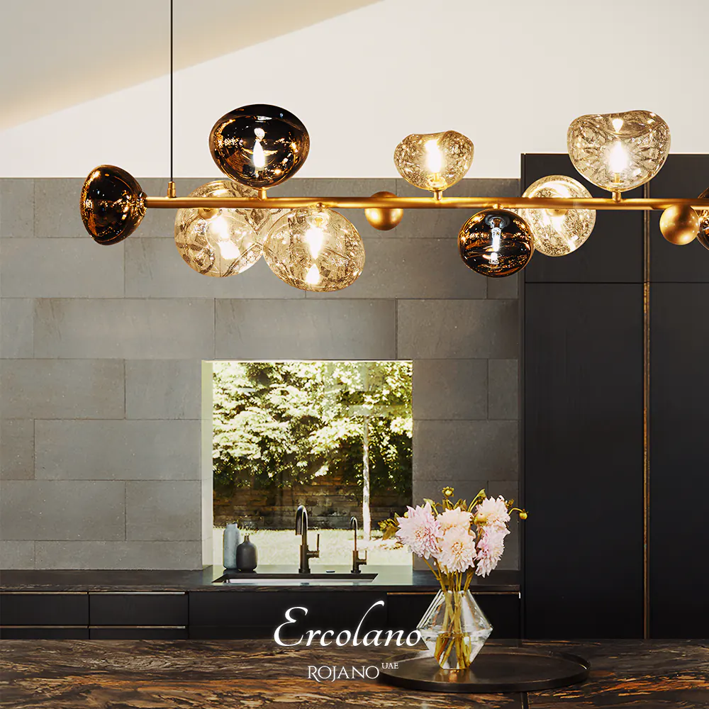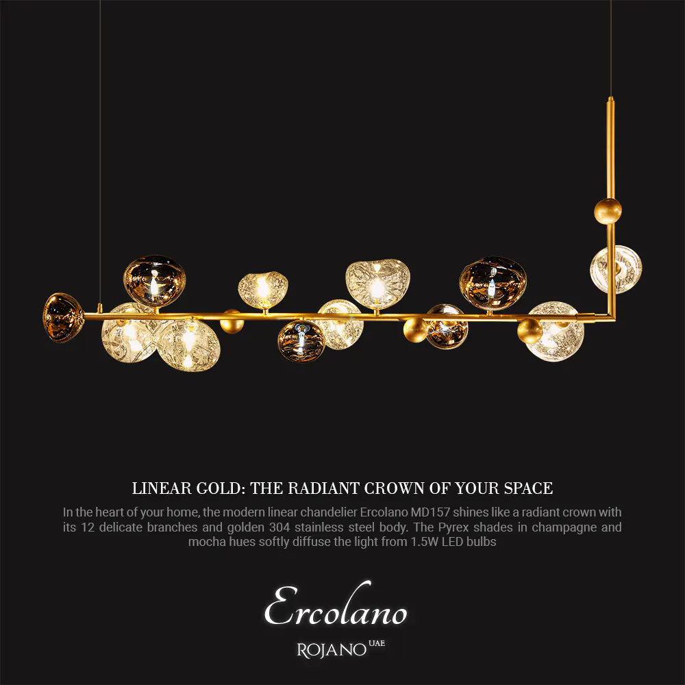 في قلب منزلك، تلمع الثريا الخطية الحديثة Ercolano موديل MD157 بتصميمها الأنيق الذي يضم 12 فرعًا رفيعًا وهيكلًا من الستانلس ستيل 304 باللون الذهبي، كأنها تاج متألق. تُوزع أغطية الكؤوس المصنوعة من البايركس بلوني الشامبانيا والموكا، ضوء مصابيح LED بقوة 1.5 واط بنعومة وهدوء في أرجاء المكان. بارتفاع متر واحد ووزن يقارب 10 كيلوغرامات، لا تُعد هذه الثريا مجرد رمز للمتانة والجمال فحسب، بل تحول فضائك إلى قصيدة فريدة لا تُنسى بفضل إضاءتها الساحرة وموفرة للطاقة.