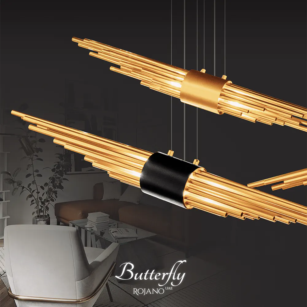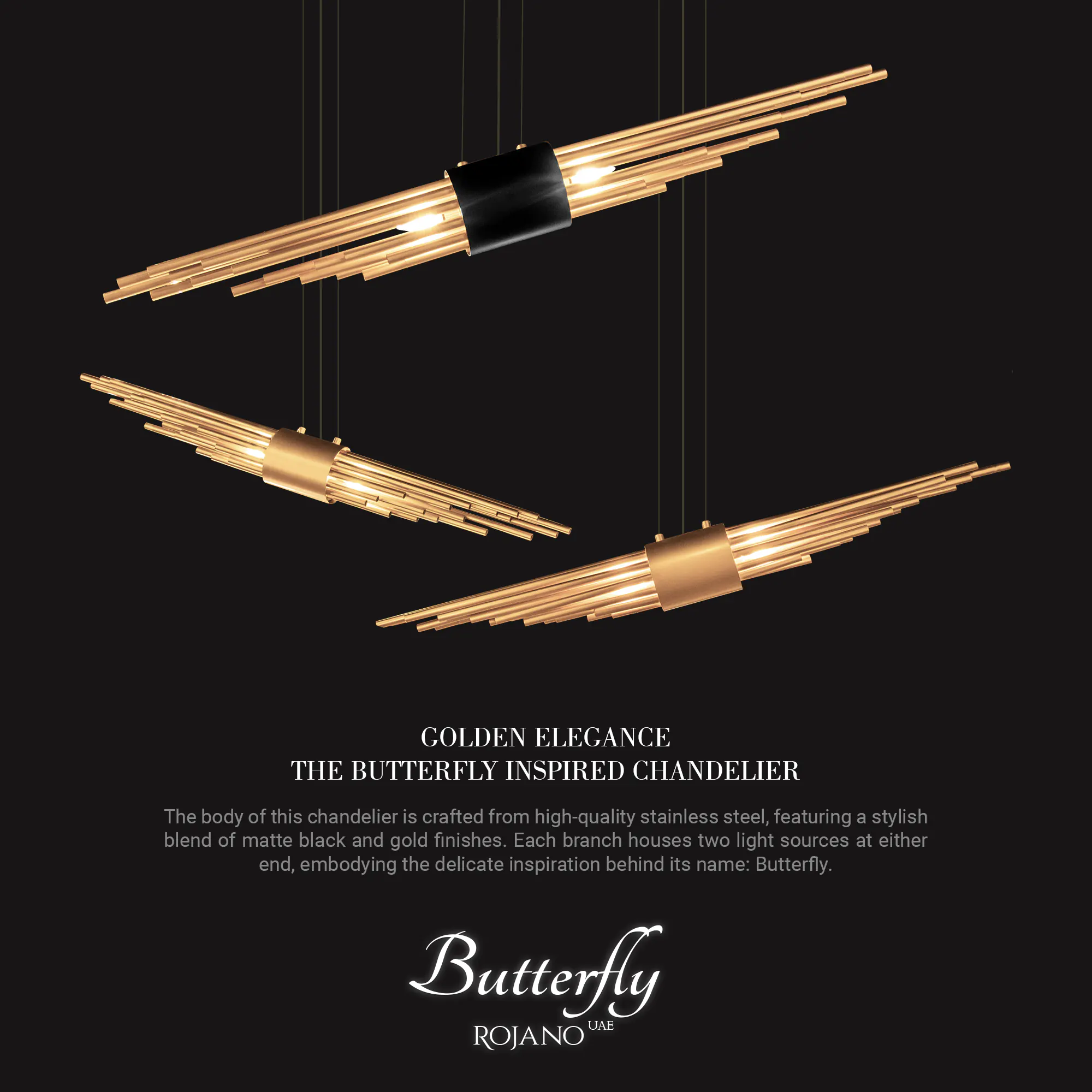 تم تصنيع هيكل هذه الثريا من الفولاذ عالي الجودة، ويتميز بدمج ألوان الذهب والأسود غير اللامع. تحتوي كل فرع من هذه الثريا، التي استوحيت تسميتها من الفراشة (Butterfly)، على مصدرين للضوء عند كلا الطرفين.
