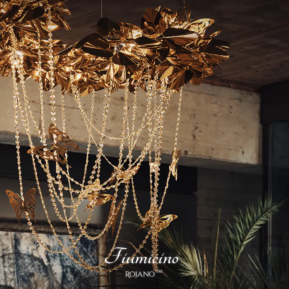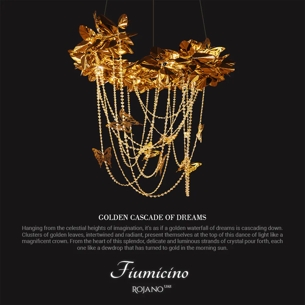 من عليّاء الخيال، تتدفق شلالات ذهبية من الأحلام! عناقيد من الأوراق الذهبية المتشابكة والمتألقة، تتلألأ كتاج مهيب يعلو رقصة الضوء. ومن قلب هذا البهاء، تنساب خيوط كريستالية دقيقة وبراقة، كل منها كقطرة ندى تحولت إلى ذهب في فجر الشمس. وبين أمواج هذا النور، تحلق فراشات ذهبية الأجنحة، وكأنها تروي حكاية من حدائق الأحلام. أضف لمسة ساحرة إلى مساحتك مع هذه الثريا الفريدة!